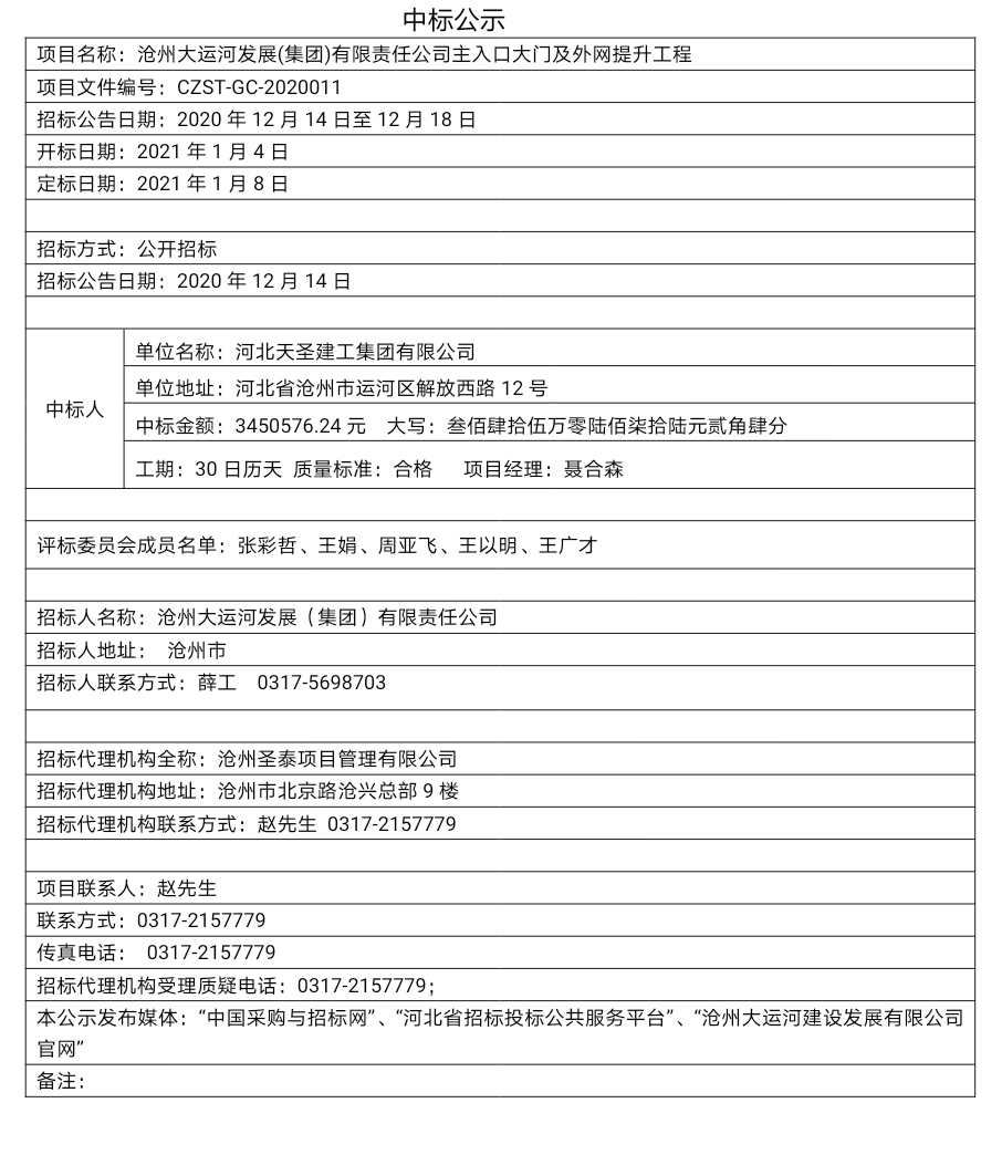 關(guān)于滄州大運河發(fā)展(集團)有限責任公司主入口大門及外網(wǎng)提升工程的中標公示